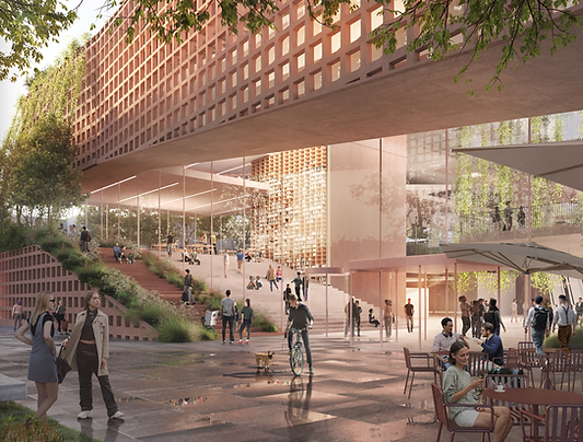 - a ramp that leads from ground level to the rooftop, creating a green oasis in the city. The rooftop serves as a green garden with public functions including an exhibition space, an open-air cinema, a basketball court, chess fields, a playground, picnic areas, and a café. Inside the spiral, the layout adopts an open-plan design with flexible, movable walls that allow for space modification.
